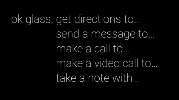 Google Glass има списък с основни команди от първо ниво (командата, която следва след „OK, Glass“). Разработчици на приложения ще могат да създават свои, но те ще трябва да бъдат предварително одобрени от Google.