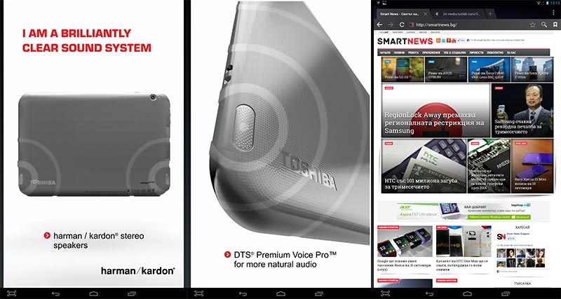 Това е подразделение на Harman International Industries и произвежда домашно и автомобилно аудио оборудване. От компанията целят да направят продуктите си максимално качествени за дадената цена и сътрудничеството им с Toshiba определено има ефект. Таблетът е чудесен за меломани или фенове на киното. Със слушалки звукът също е впечатляващ, а от Toshiba са се погрижили и софтуерно да подобрят преживяването с няколко опции за персонализация на звука. За целта имаме специално меню в настройките, което се казва Toshiba Audio Enhancement. Тук ще намерите още настройки за персонализация в подменютата на DTS® Premium Voice Pro. В настройките имате отделно меню с доста опции за увеличение обема на гласа, както и фоновия звук. Audio Enhancement технологията на Toshiba ще се погрижи за баланса между гласа и звука, който се чува на заден план.