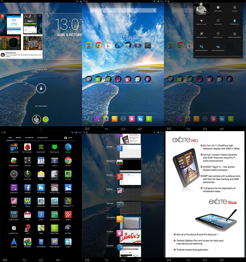 Типично за цялата серия на Excite и този модел идва с почти чист Android OS v4.2 Jelly Bean. Казвам почти, защото таблетът е лишен от дразнещите или пък не толкова добавки на производителите, като Toshiba са ни оставили сами да си решим какво да инсталираме. Интерфейсът е напълно заводски, все едно гледаме някой Nexus. Единственото, което е по-различно, е, че компанията се е постарала да ни снабди с няколко допълнителни приложения като Facebook, Evernotе, PrintHand, Skitch, ThinkFree Office Mobile 6.0, подобреното видео от Toshibа, Twitter и TruCapture. Част от тях са свързани и със специалната цифрова писалка. Приложението ThinkFree Office 6.0 е офис пакет, съвместим с Microsoft Office и с файлове в PDF формат, което е напълно оптимизирано за мобилни устройства. Може да бъде използвано за някои дейности, когато нямате компютър пред себе си.