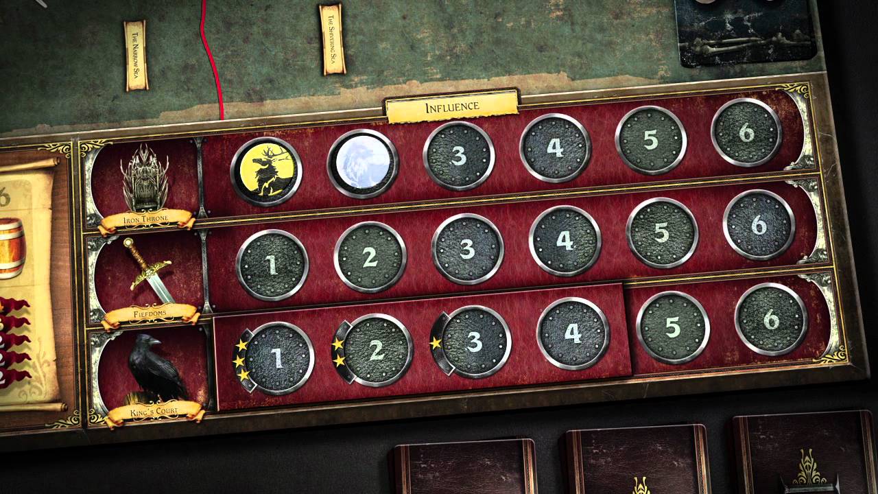 Освен към бойната част от играта, картите „Вестерос“ могат да насочат играчите към другата част на „Игра на тронове“ – „битката за влияние“. Отново изключително добре имплементирана, тя е представена чрез три скали, които могат да бъдат дори по-важни от бойната ви сила в дадени моменти. За тях ще се борите чрез своеобразната валута в играта – т.нар. „гербове на силата“. Трябва да внимавате обаче, защото всичко, което заложите, се губи, независимо от това дали спечелите или не. Това означава, че нямате възможност винаги да рискувате всичко, а освен това самите гербове имат и друго предназначение – с тях налагате контрол над завзета от вас територия, дори след като войската ви излезе от нея, и именно това ги прави още по-ценни.