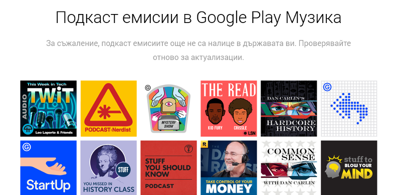За съжаление, подкастите в Google Play Music първоначално не са налични в България, както можете да прочетете от скрийншота по-долу. Не е ясно кога ще можем да ги слушаме и тук, но ще ви информираме своевременно, ако разберем нещо.
