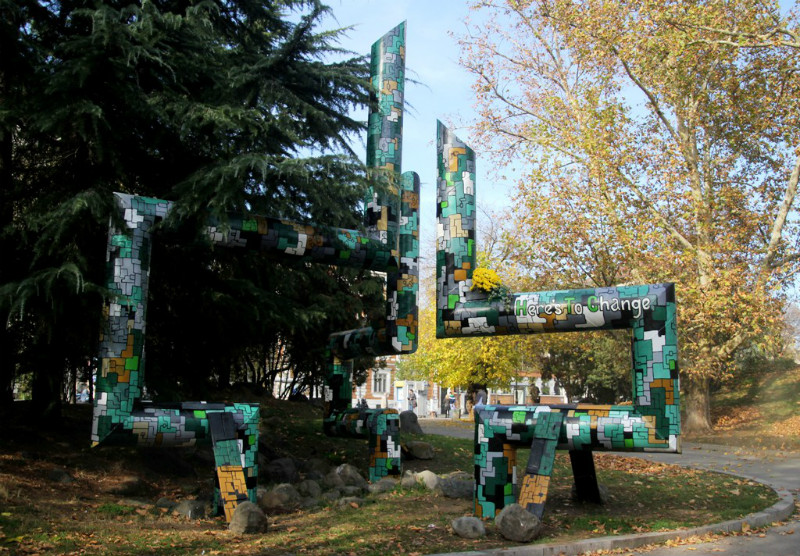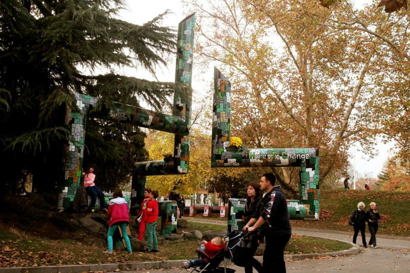 Първата локация, която младежите преобразиха в рамките на инициативата Here’s To Change, са въздухоносни тръби в парка на Съветската армия на ъгъла на бул. Васил Левски и бул. Генерал Гурко. От стара и невзрачна купчина метал тръбите се превърнаха в цветна арт-инсталация с места за сядане и свежи цветя.