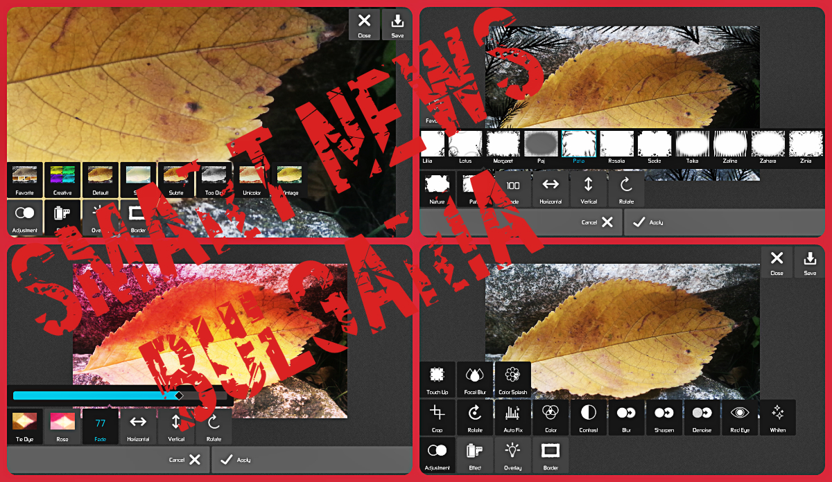 Рамки, корекции на цветовете, изостряне, старинни ефекти, светлосенки, flares и много повече, само в едно приложение.