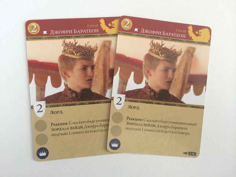 Искам да поговоря и за приликите и разликите на настоящото издание на „Игра на тронове“ и оригиналната картова игра – A Game of Thrones LCG, излязла през 2008-ма, защото определено ще възникне въпросът коя от двете да изберете. Няма правилен отговор на този въпрос, но новото издание е създадено с идеята да се опрости малко оригиналната игра, като по този начин тя да може да достигне по-широк кръг от играчи. Именно за това бих препоръчал НВО изданието на всички, които не са играли A Game of Thrones LCG, защото то въвежда много по-лесно играчите в елементите на играта. Преводът на новото издание на български език също спомага много за достъпността на „Игра на тронове“. Въпреки различните езици, аз имах надежди, че двете игри ще могат да се комбинират, но за жалост поне официално не могат да се правят общи тестета.