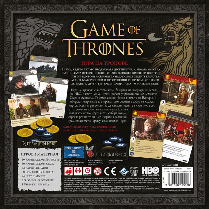 Достъпността на „Игра на тронове“ също е нещо, което ми направи голямо впечатление. Правилата са достатъчно лесни за научаване, за да не отблъснат новите играчи, а времето за изиграване е в рамките на нормалното – след като опознаете правилата, една игра ще отнема по-малко от час. Ако я харесате и правилата не ви се сторят много сложни, винаги можете да закупите и оригиналното издание, което ще ви предложи повече домове, както и вариант за четирима играчи. Българските издатели от Фантасмагория са се погрижили за тези от вас, които се решат да изпробват и двете игри, защото в края на книжката с правилата ще откриете талон за 20% отстъпка от Core Set-a на A Game of Thrones LCG.
