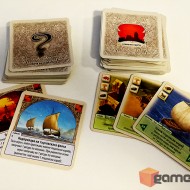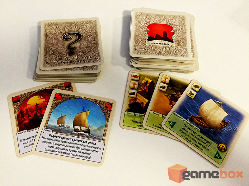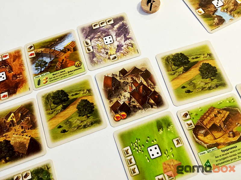 Както ще забележите, вторият зар е малко по-специален – на него има различни събития, които променят хода на играта.Най-нежеланият резултат определено е червеният… дървен крак? Въпреки странното изображение, единствената червена страна е лесна за различаване и, ако я видите след хвърляне, ще трябва да преброите ресурсите си, защото всеки играч с повече от седем ще трябва да загуби всичкото си злато и вълна. Останалите резултати варират от бонус ресурси за играчът с повече умение или търговия, до теглене на случайни събития, които могат да са полезни или неблагоприятни и за двамата играчи.