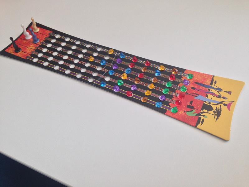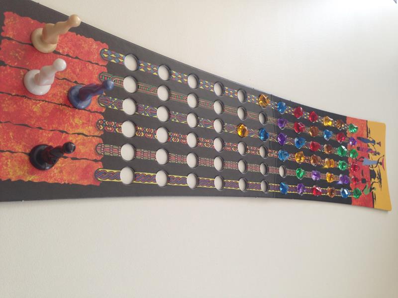 Нарочно оставих игралното поле и точките за накрая, защото те са нещо като отделна мини-игра. Игралното поле има две части, които се сглобяват на масата и образуват нещо като пътека с шест коридора. Те пък са просто поредица от дупки в полето, в които се слагат точките. Ще ги видите под формата на шест цвята кристали и преди всяка игра трябва да бъдат разпределени по дупчиците на случаен принцип. Освен интересните африкански символи по игралното поле, впечатление правят шестте оранжеви места в началото му. Именно там всеки от играчите поставя своята фигурка, която предварително е избрал в началото на играта. Самите фигурки също не изневеряват на стила на играта и са доста странни като основната асоциация може би е с пламъци, но на мен ми приличат на разтеглени сладоледи.
