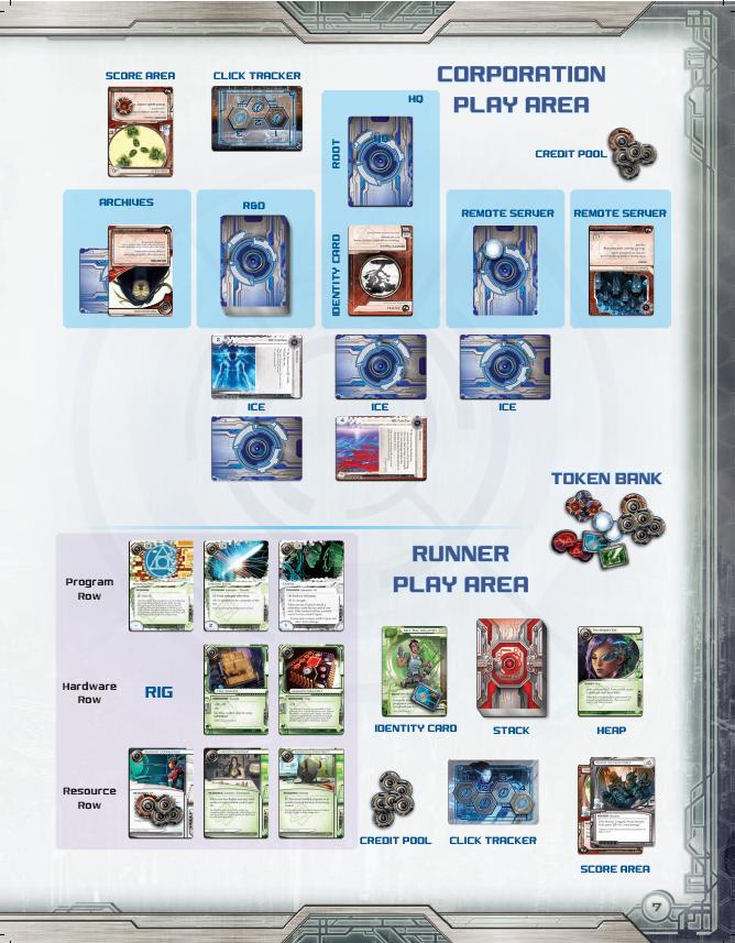 В началото на играта този, който поема ролята на корпорацията, поставя своята „Identity” карта на масата, заедно с тестето си. Те имат роля на първите два сървъра на корпорацията, а самите сървъри се делят на два вида – централни и отдалечени. Централните сървъри са всъщност картите в ръката на корпорацията (наречен Headquarters или HQ), представени от самоличността на корпорацията – Identity картата, тестето на корпорацията (R&D или Research and Development) и изиграните или унищожени карти на корпорацията (Archives). Отдалечение сървъри пък се създават от самата корпорация с инсталирането на карти в тях. Именно там трябва да скриете своите agenda карти. Да, те трябва да не се виждат, защото до сега не бях споменал може би най-важната подробност за корпорацията – тя инсталира всички свои карти с лице надолу.