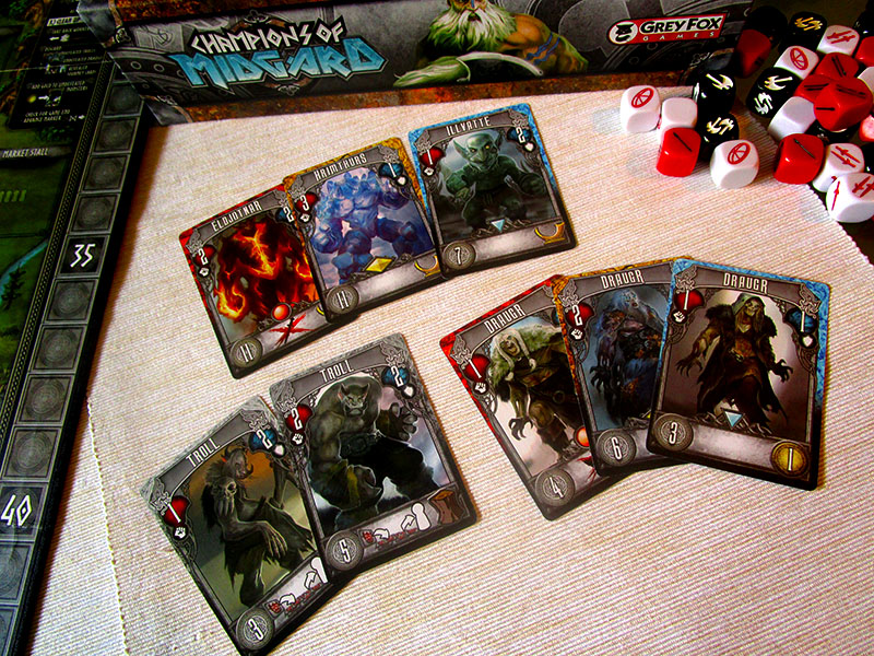 Макар да са скучновати, местата из селото, които носят различните видове ресурси и карти са нужни, ако искате да се подготвите за битки. Последните идват в Champions of Midgard под няколко форми. На първо място по важност е тролът – този грозник трябва да бъде победен всеки ход, защото в противен случай селяните ще хвърлят вината върху вас, играчите. Хвърлянето на вината става съвсем буквално – ако тролът остане жив след края на битката с него, всеки от играчите получава удар по главата под формата на така наречените blame жетони. Те са нещо като негативни точки, които губите на края на играта, но с едничката особеност, че натрупването им води до внушителни загуби.