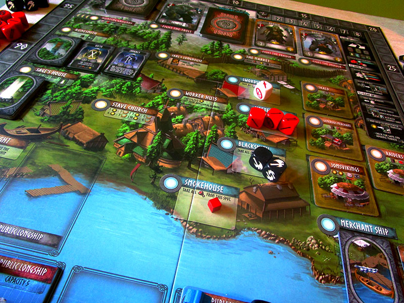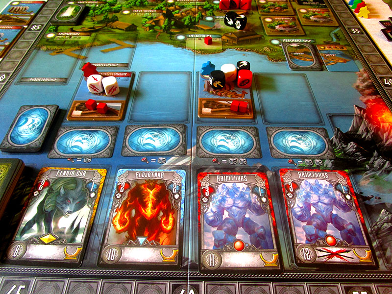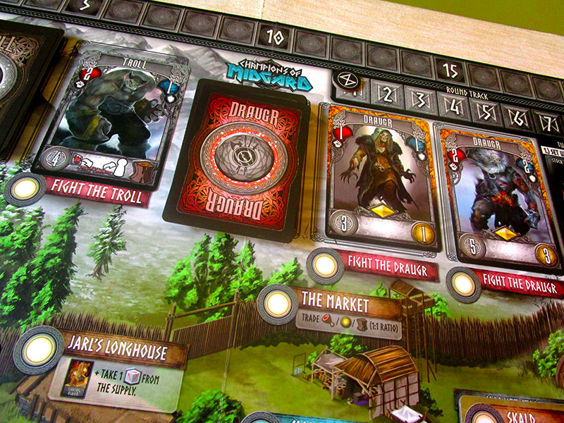 С това можете да се справите почти само като убивате трола (а не като го храните!). Именно затова тази дестинация е сред предпочитаните от участниците, макар да не представлява точно почивка на плажа. Битките се водят чрез мятане на отредените от вас за всяка локация зарчета/воини, като трите типа такива – мечове, копия и брадви, имат своите особености и силни/слаби страни. Ключова при схватките е подхотовката, тъй като между отделните рундове на боя е напълно нормално да губите зарчета, следователно е добре да сложите правилните като вид или брой такива, ако не искате да останете с пръст в уста. Ако не сте особено обичани от заровете, не се бойте – Champions of Midgard ви дава възможност да хвърлите отново неуспешните си опити чрез favor жетоните, а копиеносците и мечоносците имат щитове, минимизиращи загубите.