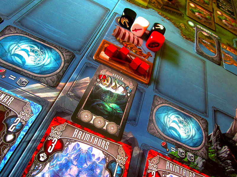 За тази цел имате нужда от няколко неща. С кораб можете да се сдобиете като си построите собствен, или като ползвате двата общи. И в двата случая ще ви трябват воини и храна, с която да гарантирате, че последните ще останат сити (живи) до достигане на дестинацията си. Преди да се срещнете и да се посбиете с чудовищата, които ви чакат там, трябва да преминете през една карта със събитие, което почти винаги е неприятно. Дали липсата на вятър ще изчерпа запасите ви от храна, или на палубата ви ще се метне легендарния кракен, трябва да сте готови за сакатлъци. Макар да разчупва визията на контролирана игра с работници, в която няма много късмет, този елемент е интересен, защото внася известна доза вълнение при пътуванията.
