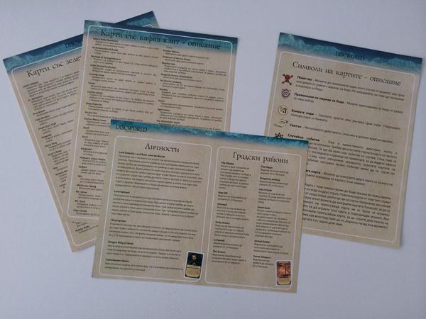 Искам да отделя внимание на превода на играта. Тя не е изцяло на български език, но е възможно съвсем лесно да бъде играна, без да знаете английски. Това е възможно благодарение на отделната, изцяло преведена на български книжка с правила, която ще намерите в кутията на играта. Заедно с правилата ще намерите и обяснение на всяка карта, която има текст на английски, както и много полезни картончета с описания на основните правила, които да ползвате като помощни листове, за да не се налага да ровите в правилата винаги, когато забравите нещо. Самите правила са само три страници и са много лесни за усвояване, а повечето от тях могат да бъдат обяснени дори в хода на играта.