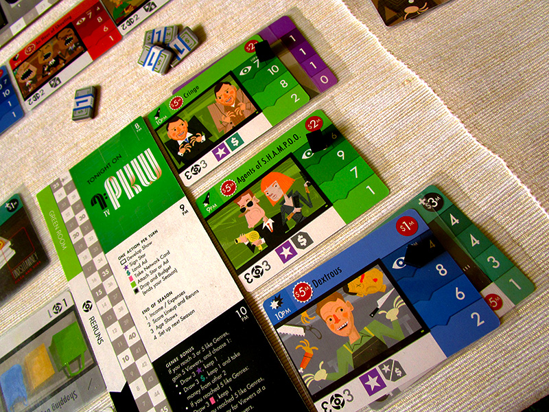 Основополагащи за телевизията ви са предаванията – без тях няма как да привлечете зрители. Това са и картите, за които най-свирепо ще се борите с останалите играчи, тъй като те са разделени на жанрове и имат различни показатели. Механиката на излъчване на предаванията е хитра – всяка карта предпочита различен времеви слот, за да бъде максимално ефективна през първия си сезон. Наред с това искате да взимате карти, които ви позволяват да наблъскате реклами и да привлечете още зрители с някоя известна личност. Тъй като картите не са съвсем равнопоставени, често ще ви се налага да променяте плановете си според това какво остава невзето от другите играчи.