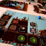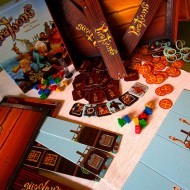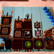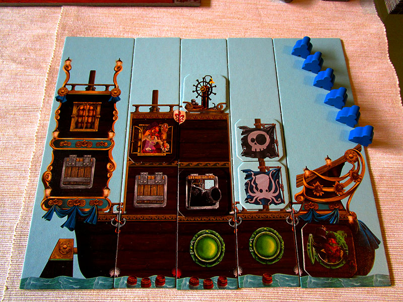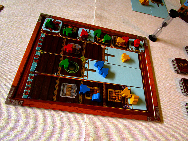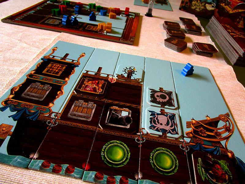Интересна е съдбата на непоисканите парчета от кораби или екипировка (както и тези с равенство при залагането). Корабините компоненти са прекалено тежки да плуват и се губят безвъзвратно при изсипването им в морето, но за останалите ще имате възможност да се борите още веднъж в следващата фаза – аукционът. За него се ползват и гореспоменатите гофрети/дублони. Отхвърлените компоненти можете да придобиете чрез сляпо залагане, в което най-щедрият играч получава възможността да избере плочка преди останалите. Тази възможност е първото нещо, което ми направи по-положително впечатление в Piratoons, тъй като е балансиращ елемент при наличието на огромна доза ловкост и късмет в предишната фаза.
