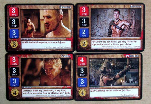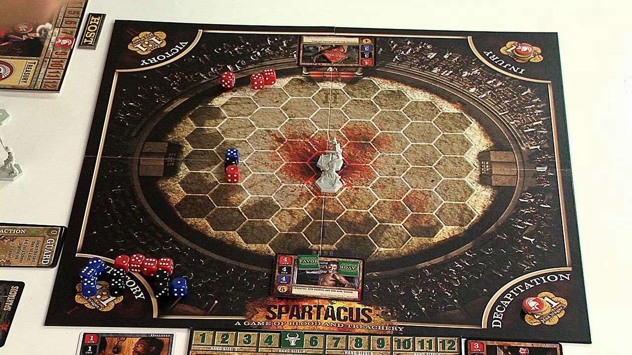 След като все пак гладиаторите се срещнат и започне същинският двубой, ще трябва да използвате и червените и черните зарове. Механиката е наистина доста оригинална и макар и да разчита само на шанса, е забавна. Когато атакувате опонента, ще хвърляте своите червени зарове (равни на точките атака на избрания гладиатор), а противникът ви ще използва черните – за защита. След това и двамата подреждате заровете си от по-високи към по-ниски и ги сравнявате. Всеки резултат на атака, който е по-голям от съответстващия му зар за защита на опонента, нанася една точка щета (с някои особености, в които няма да се впускам). За всяка поета щета защитаващият се гладиатор трябва да се откаже от един от своите зарове и именно това прави системата за битки гениална – с понасянето на удари бойните умения на гладиатора отслабват. Освен това изборът винаги е труден – дали да се откажете от скорост, ставайки лесна мишена за по-маневрени опоненти, или пък избирате да намалите защитата или атаката си, правейки битката по-трудна за печелене?