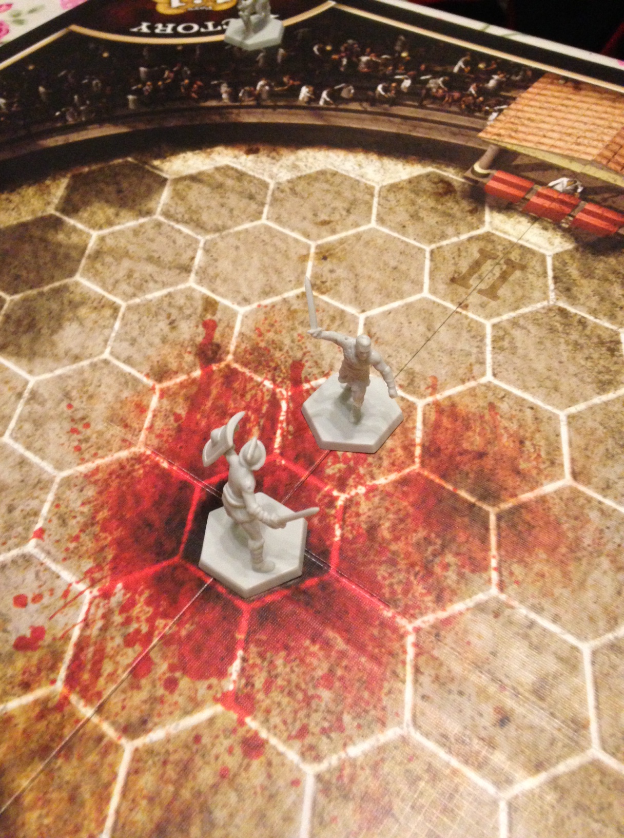 Всъщност самата битка заедно със залозите е единственото място, за което ви е нужна игралната дъска. Тя представлява арена, разделена на шестоъгълници с два входа за гладиаторите. Битката е нещо като мини игра, която се води с помощта на зарове, като механиката й e много елегантна. Всеки от гладиаторите разполага с точки за атака, защита и скорост, които са представени съответно с червени, черни и сини зарове. По-силните гладиатори имат повече на брой зарове, а общият брой на самите тях представлява точките за живот на боеца. От скоростта на гладиатора ще зависи колко полета ще може да се придвижва всеки ход, а сините зарове ще хвъляте в началото на хода си, за да определите инициативата или с други думи – кой ще действа пръв. В началото на битката гладиаторите ще бъдат в двата края на арената и ще трябва да се срещнат, за да започнат да разменят удари. Тук играта е малко тромава, защото бойната система е опростена и понякога играчите се опитват да заемат колкото се може по-добра позиция, за да нанесат първи удар. Възможно е да се получат няколко хода, в които само обикаляте арената в търсене на шанс за атака.