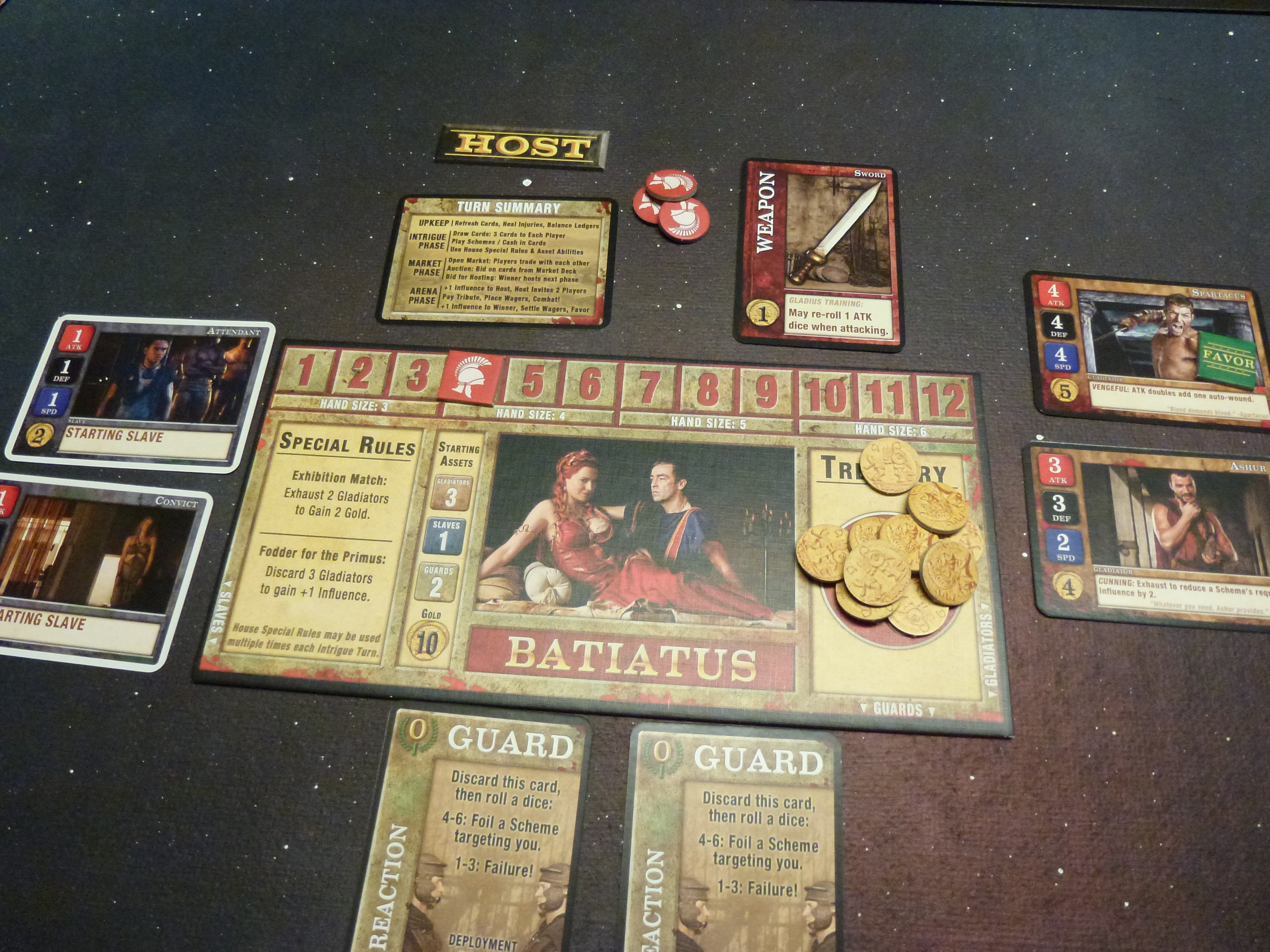 Все пак трябва да отбележа, че Spartacus не е за хора, които не обичат противопоставянето – играта е брутална в това отношение. Почти всички scheme карти прецакват сериозно опонентите ви и трябва да сте сигурни, че в момента, в който изпреварите останалите по влияние, всички ще се обърнат срещу вас. Ако не харесвате такива игри, то Spartacus със сигурност ще ви разочарова, защото това е може би най-състезателната игра, която съм играл някога.