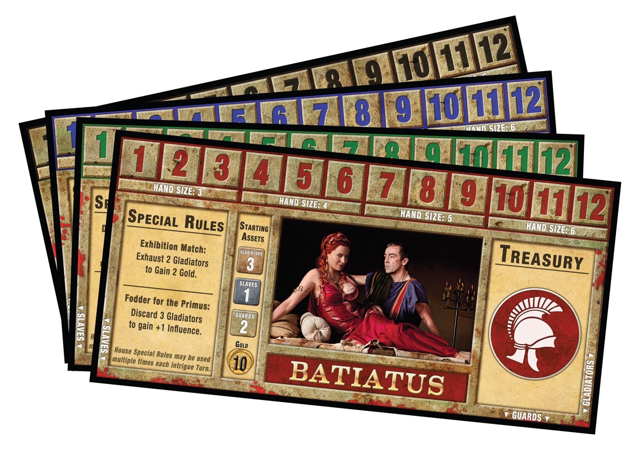 От друга страна, всички карти са с добро оформление, а картинките на гладиатори и роби, както и допълнителните текстове, са взети направо от сериала, което спомага на играта да се доближи до сериала. Трябва да се отбележи, че на кутията има предупреждение за препоръчителна възраст на играчите 17+, но освен няколко нецензурни цитата, в някои от картите в играта няма друго съдържание, което да оправдае подобно съобщение (don’t get your hopes up, няма голотии). Останалите компоненти – различните жетони и монети, са на ниво, а фигурките на гладиаторите са оформени детайлно, макар и да идват небоядисани, което е ужас за някой като мен, който е като сакат с четка в ръка. Таблата на фамилиите също са със снимки от сериала и оформлението им е подходящо за темата на играта.