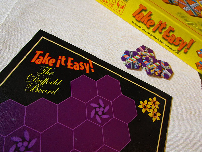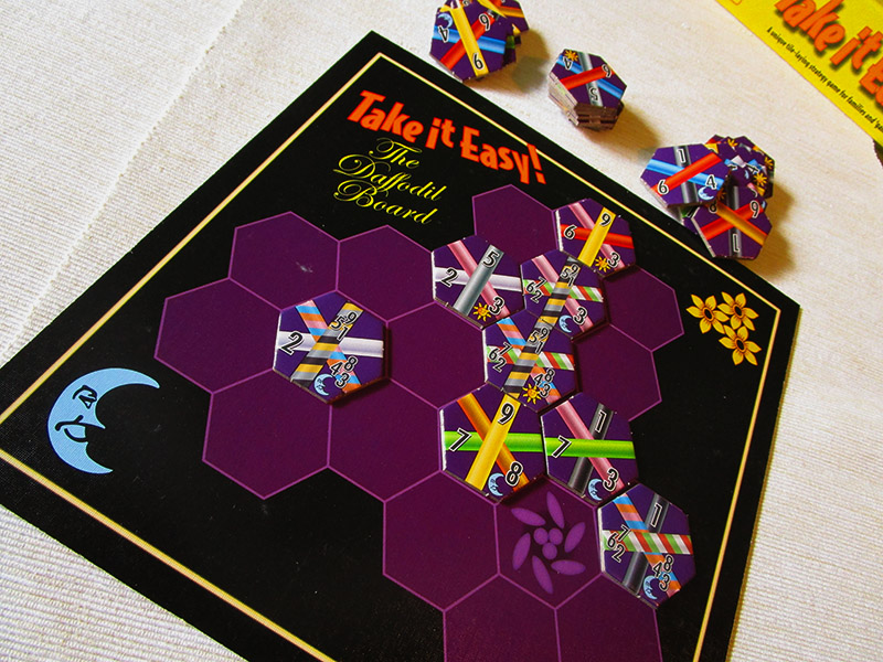 Take it Easy! явно разчита донякъде на вариантите – в Daffodil Edition-ът, който виждате на снимките са поместени два основни начина за игра, както и общо 9 варианта за играенето им. Горе ви посочих базовата Take it Easy!, но за любителите на разчупените вариации е доста по-подходящ гърба на игралните табла – така нареченият Daffodil Board. При него формата, в която трябва да наредите плочките си е малко по-разчупена и предлага ново предизвикателство – да успеете да подредите значително по-дълги линии.