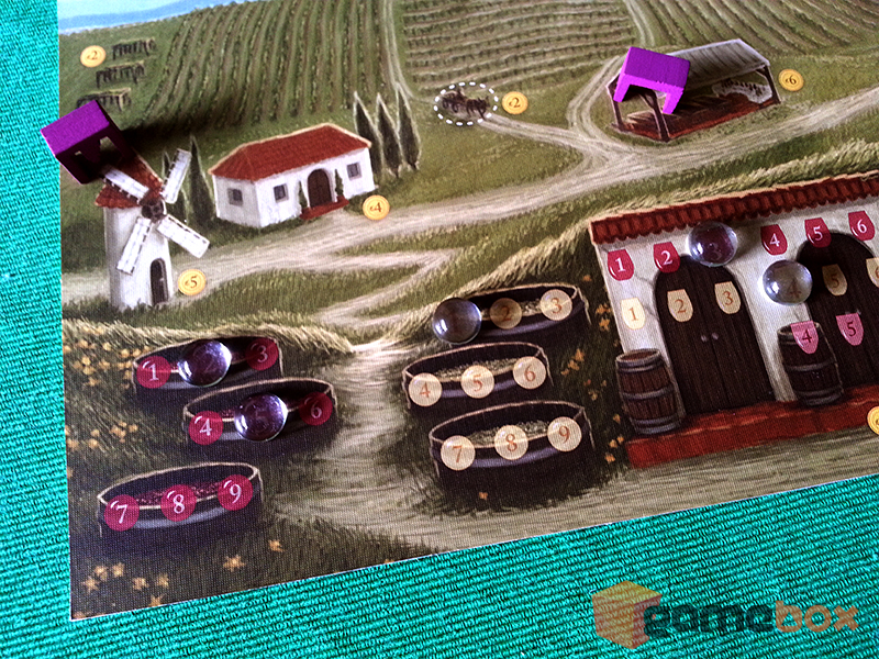 В тази връзка много ми харесва един от компонентите на Viticulture, които пропуснах в началото. Гроздето в коритата за мачкане и бутилките в избата ви се отмерват с малки стъклени мъниста, които увеличават числото, на което са поставени. Макар да не е невиждана, тази идея придава доста стил на таблата ви, а освен всичко друго е и доста функционална.