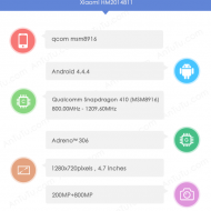 Неговите спецификации се появиха онлайн благодарение на AnTuTu. Кодовото му име HM2014811. Смартфонът ще бъде с 4.7-инчов дисплей с резолюция 720 x 1280, 64-битовия Snapdragon 410, който има четири ARM Cortex-A53 ядра с тактова честота 1.2GHz и графичен ускорител Adreno 306.